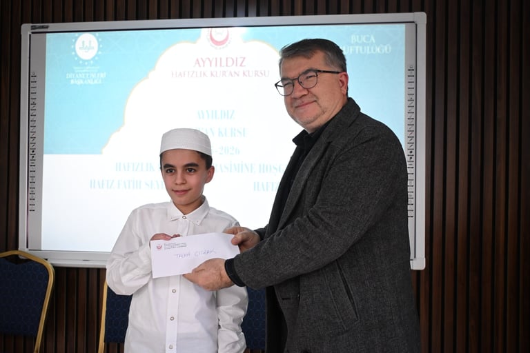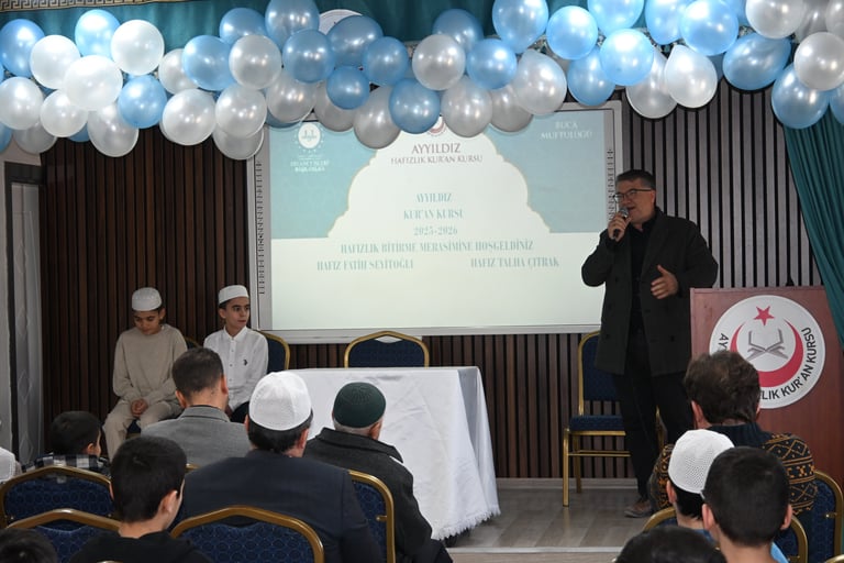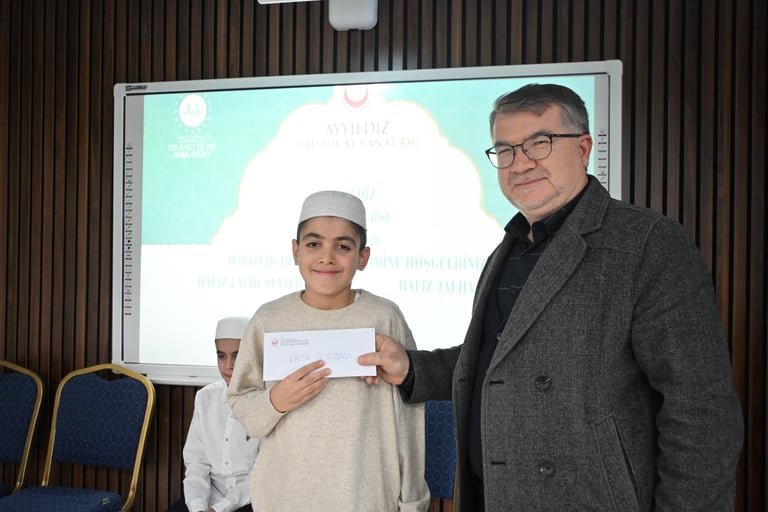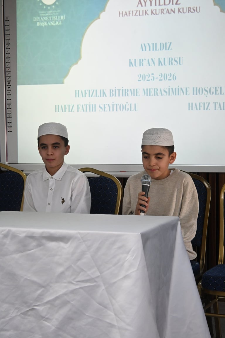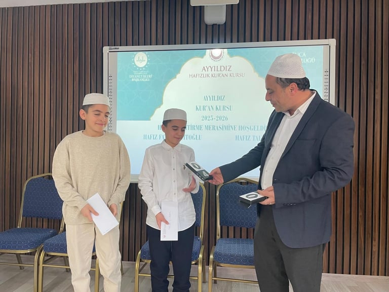 Ayyıldız Kur’an Kursu olarak, hafızlık eğitimlerini başarıyla tamamlayan öğrencilerimiz Fatih Seyitoğlu ve Talha Çıtrak için anlamlı bir program gerçekleştirdik. Hafızlığını tamamlayan öğrencilerimize çeşitli hediyeler takdim ettik, kendileri adına pasta keserek bu önemli başarıyı birlikte paylaştık.
